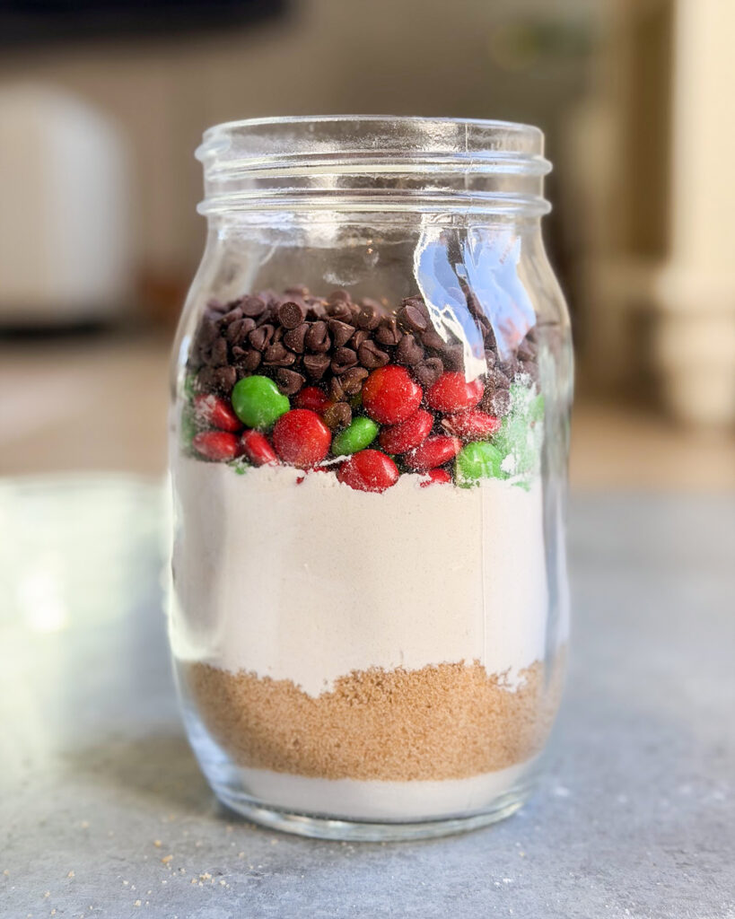 Step 2: Layer the Ingredients in the Jar. Add the dry ingredients into the bottom of a 32 oz jar. Alternate adding different colored ingredients so the colors stand out. I like to do the brown sugar, then granulated sugar, then chocolate chips, and M&Ms. The mix won’t quite come to the top of the jar.
