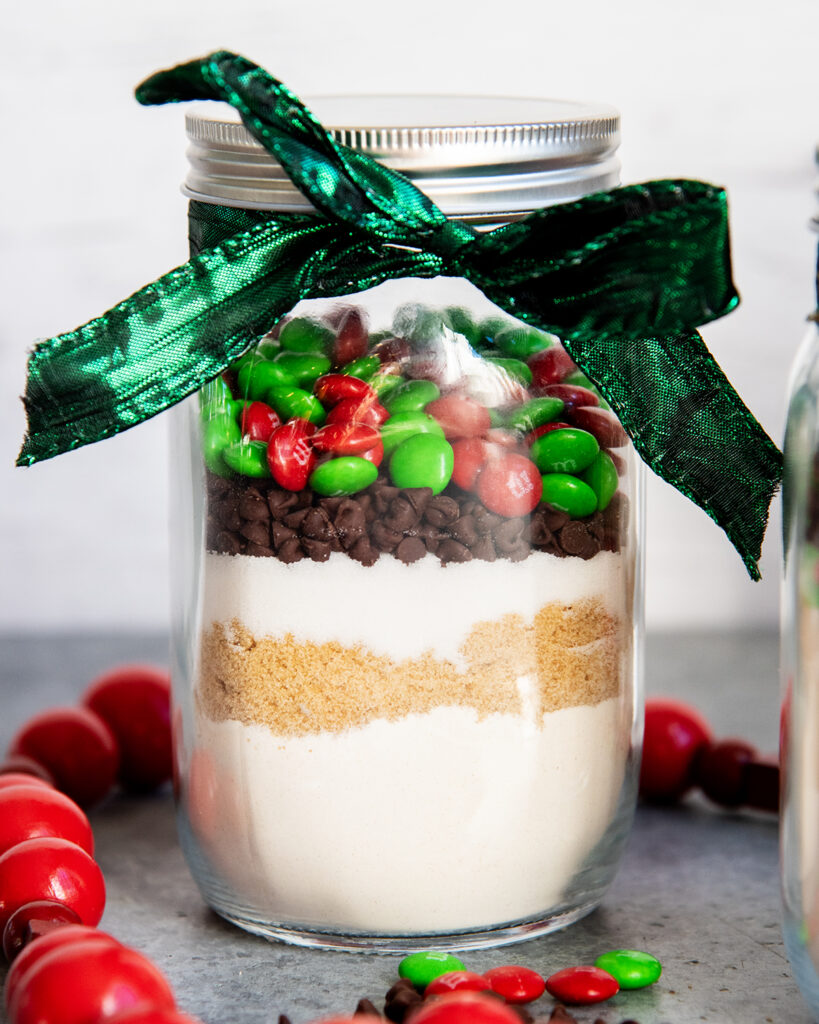 - Super Festive: Layered in the jar, with red and green m&ms, and tied with a cute bow these jars are so pretty and festive!